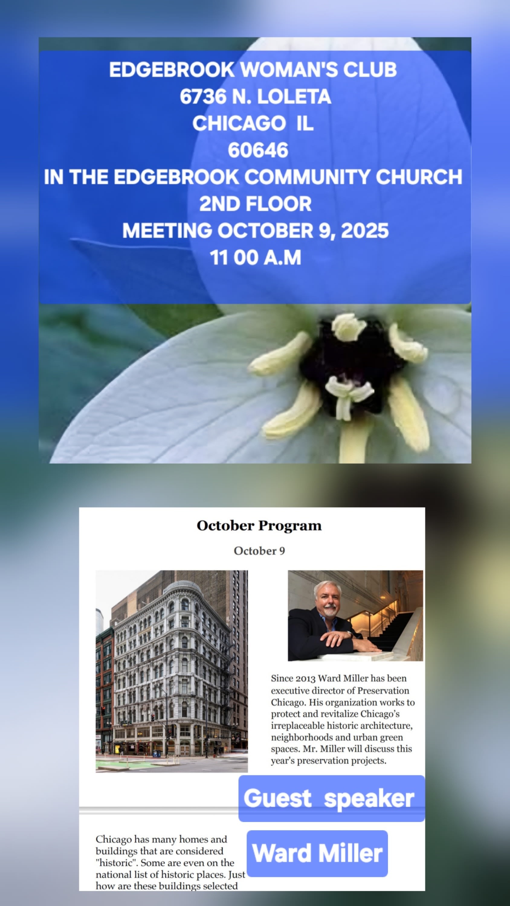 JOIN US on October 9, 2025 at 11 am for a meeting and a light lunch at our new location Edgebrook Community Church at 6736 N. Loleta on the 2nd floor. Our guest speaker is Ward Miller, a historian on Chicago Architecture.